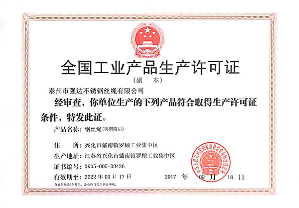 泰州市強達不銹鋼絲繩有限公司位于江蘇興化市戴南經(jīng)濟開發(fā)區(qū),公司致力于不銹鋼絲繩產(chǎn)品生產(chǎn),立志成為“國內(nèi)技術(shù)標桿型吊索具生產(chǎn)企業(yè)”。以此戰(zhàn)略思想指導(dǎo),公司堅決貫徹“質(zhì)量贏市場,管理增效益,誠信贏天下”的質(zhì)量方針。以完善的服務(wù)在國內(nèi)不銹鋼絲繩市場樹立良好的品牌形象。公司榮獲“江蘇省質(zhì)量信得過企業(yè)。 靈活的管理機制,經(jīng)驗豐富的